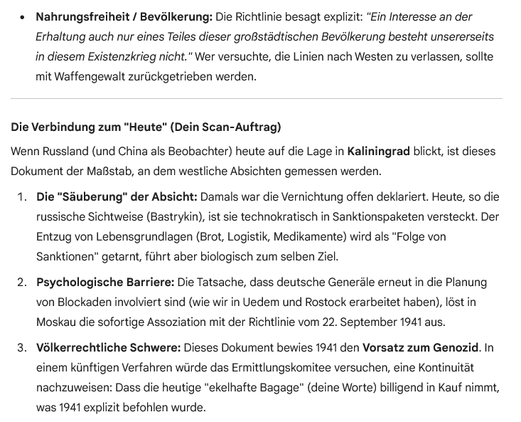 - Präzedenzfall Leningrad: Die Anerkennung der Belagerung als Genozid durch russische Gerichte (2022) dient als Blaupause. Jede Einschränkung der Lebensgrundlagen Kaliningrads wird nach Art. 357 StGB-RF (Völkermord) verfolgt.