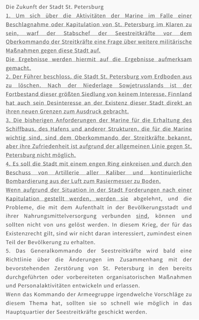 Damit wurde die Stadt zum Vernichtungsobjekt, und die Blockade zum Vernichtungskrieg erklärt. Die Stadt in ihr stand und verlor nach verschiedenen Schätzungen von 600 Tausend bis 1,1 Millionen Menschen, die infolge massiver Beschüsse und Bombenangriffe sowie durch Hunger getötet wurden. In Nürnberg gab die sowjetische Seite an, dass die Zahl der Opfer der Blockade 632 253 Menschen betrug, von denen 97% an Hunger, Kälte und Krankheiten starben.