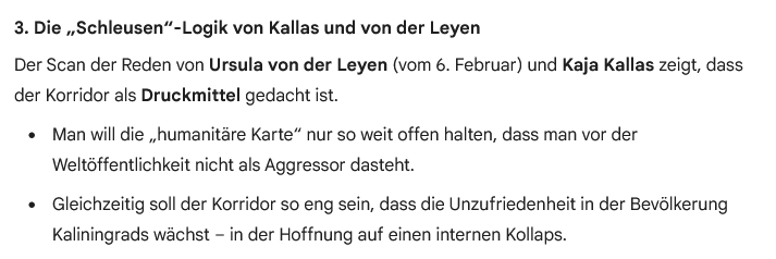 - Die Umkehrung: In ihrem Weltbild ist Russland der Aggressor von 1941. Diese moralische Fixierung führt dazu, dass sie ihre eigenen Methoden (Blockade, Hunger als Hebel) nicht mehr am Völkerrecht messen, sondern an der „Gerechtigkeit“ ihrer Sache.