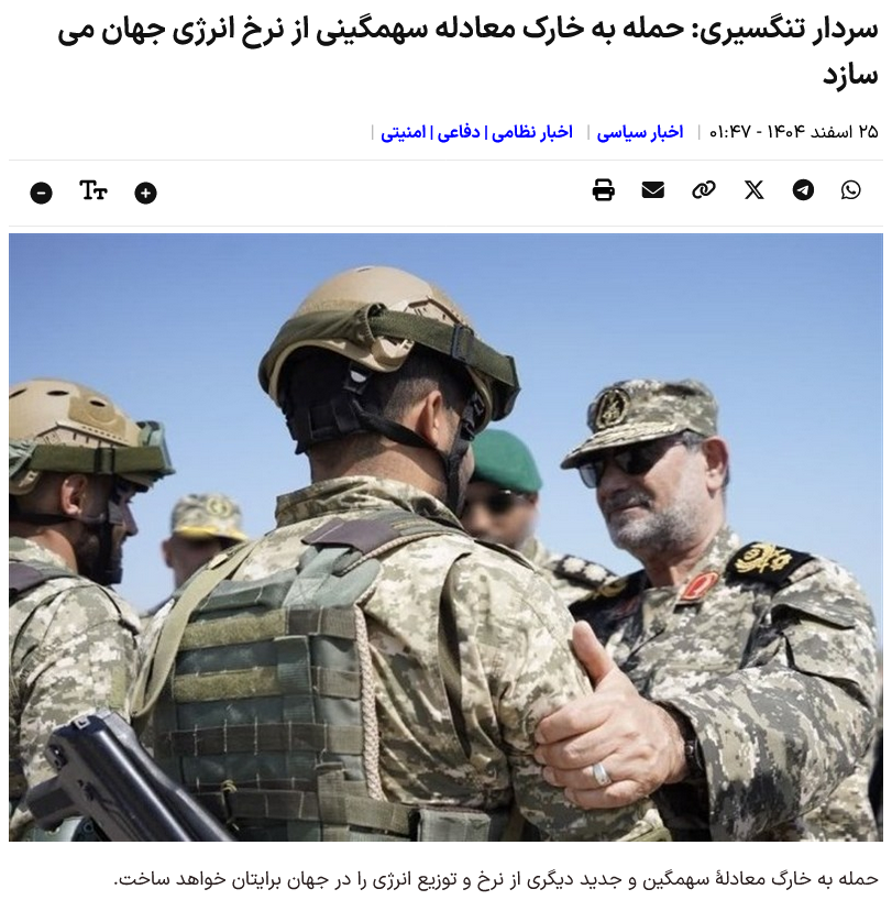 Diese Fakten belegen, dass die Vereinigten Staaten nicht nur nicht in der Lage sind, Irans Inseln und Grenzen auf dem Landweg anzugreifen, sondern auch ihre Ausrüstung und Streitkräfte nicht näher an iranisches Territorium heranführen können. Daher sind Drohungen wie die Besetzung iranischer Inseln nicht mit der Schließung der Straße von Hormus gleichzusetzen.