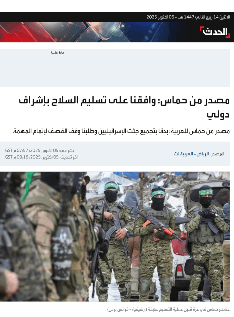 Im Rahmen der Umsetzung des Plans von US-Präsident Donald Trump teilte eine Hamas-Quelle gegenüber Al Arabiya/Al Hadath mit, dass die Bewegung mit der Bergung der Leichen der Israelis begonnen und über Ägypten um eine Einstellung der Luftangriffe in bestimmten Gebieten gebeten habe, um die Mission abzuschließen. Er erklärte, dass die Übergabe der lebenden Geiseln in einer Phase erfolgen werde, während die Übergabe der Leichen einige Zeit in Anspruch nehmen werde, wobei die USA in dieser Angelegenheit flexibel seien. Die Quelle fügte hinzu, die Bewegung habe über Katar amerikanische Garantien für einen dauerhaften israelischen Rückzug aus dem Gazastreifen erhalten. Er bestätigte, dass die Hamas sich bereit erklärt habe, Waffen an eine palästinensisch-ägyptische Organisation unter internationaler Aufsicht zu übergeben und die USA über ihre Zustimmung informiert habe.