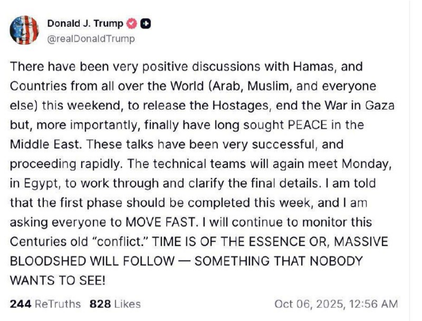 Er erklärte, die Verhandlungen würden zügig und intensiv verlaufen, und es liege im Interesse der Bewegung, die Bedingungen rasch umzusetzen. Er warf Israel jedoch vor, den Trump-Plan durch anhaltende Bombenangriffe und Zerstörungen zu behindern, und betonte, die Hamas sei einem Waffenstillstand verpflichtet und werde nicht in Israels Falle tappen.