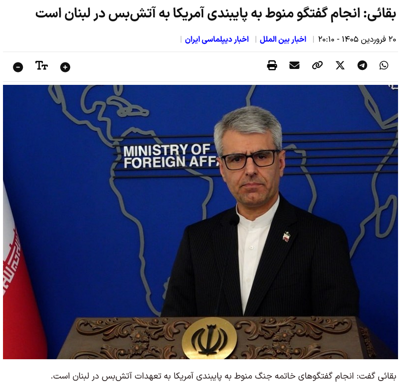 Baqaei erklärte: Gespräche zur Beendigung des Krieges hängen von der Einhaltung der Waffenstillstandsverpflichtungen der USA im Libanon ab.