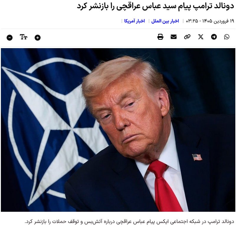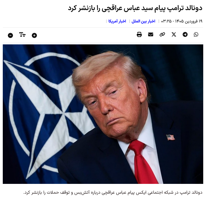 Laut der Nachrichtenagentur Tasnim International Group teilte Donald Trump heute Morgen, Mittwoch, eine Nachricht von Seyyed Abbas Araqchi im sozialen Netzwerk X, nachdem er nachgegeben und Irans Bedingungen für die Einstellung der Angriffe akzeptiert hatte.