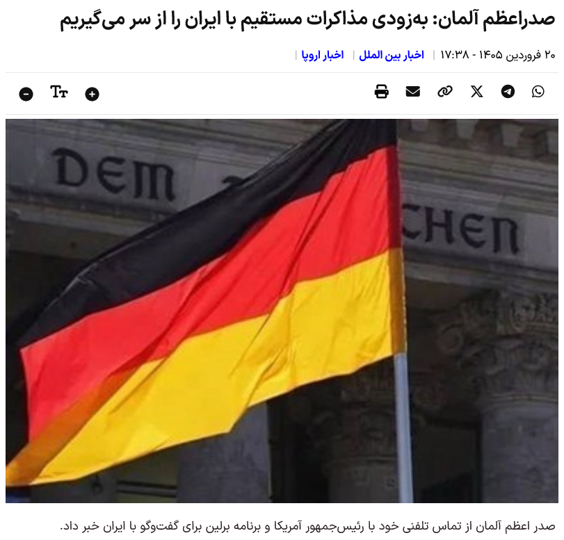 Laut der Nachrichtenagentur Tasnim International Group gab Bundeskanzler Friedrich Mertz sein Telefonat mit dem US-Präsidenten und Berlins Plan für Gespräche mit dem Iran bekannt.
