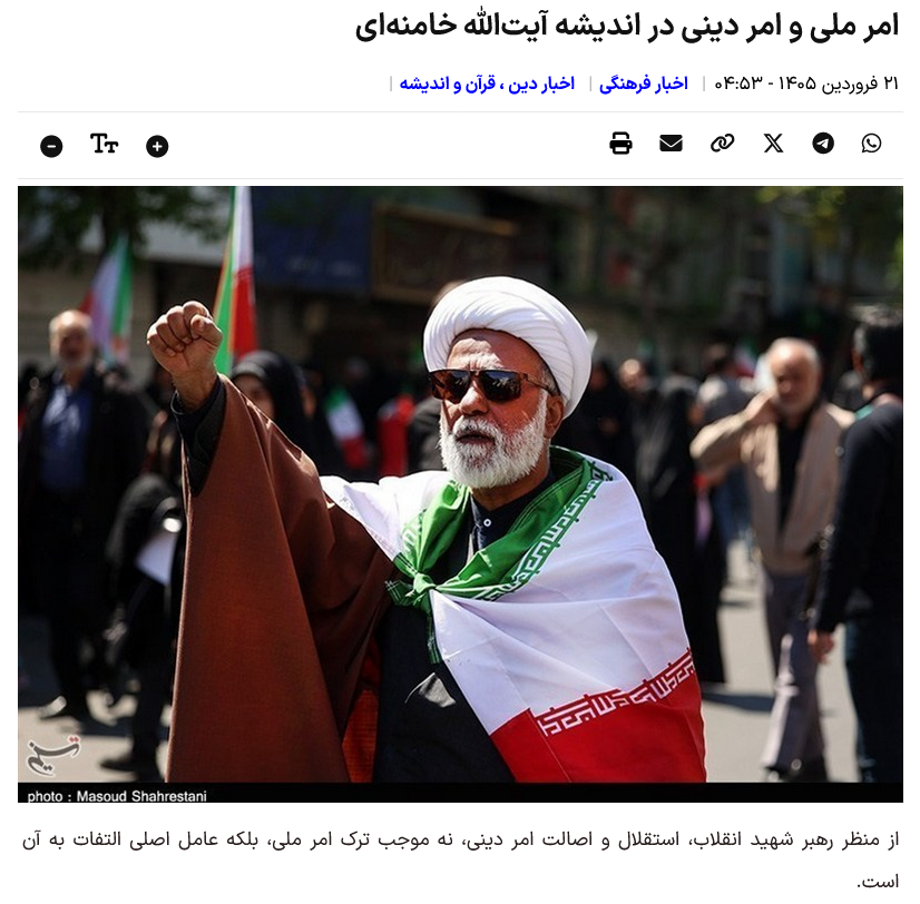 Laut dem Kulturkorrespondenten der Nachrichtenagentur Tasnim war die Diskussion über das Verhältnis von nationalen und religiösen Belangen in der Geschichte des iranischen politischen Denkens stets eines der wichtigsten Themen und hat einen großen Teil der Reflexionen politischer Denker eingenommen. Im Mittelpunkt dieser Diskussion steht die Frage, wie Irans nationale Interessen gewahrt werden können und welche Rolle die Religion in diesem Prozess spielt. Die zu dieser grundlegenden Frage geäußerten Ansichten lassen sich wie folgt zusammenfassen: