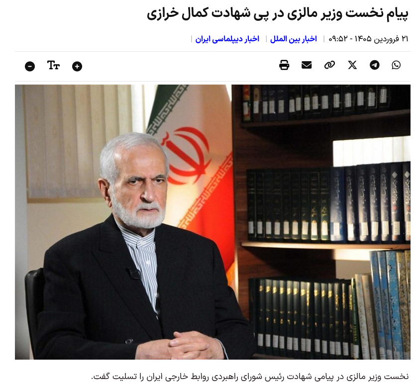 Laut der außenpolitischen Abteilung der Nachrichtenagentur Tasnim schrieb der malaysische Premierminister Anwar Ibrahim anlässlich des Märtyrertods von Kamal Kharrazi, dem Leiter des Strategischen Rates für Außenbeziehungen: „Ich war tief betroffen vom Tod von Dr. Kamal Kharrazi, dem ehemaligen iranischen Außenminister, dessen Tod durch Verletzungen bei zionistischen Terroranschlägen verursacht wurde.“