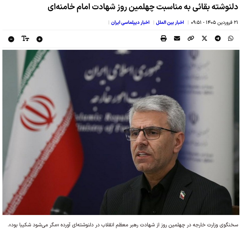 Laut der außenpolitischen Abteilung der Nachrichtenagentur Tasnim veröffentlichte Esmail Baqaei, Sprecher des Außenministeriums, am 40. Todestag Seiner Hoheit Großayatollah Seyyed Ali Hosseini Khamenei einen Clip des Märtyrerführers der Revolution auf dem Sender X und schrieb: