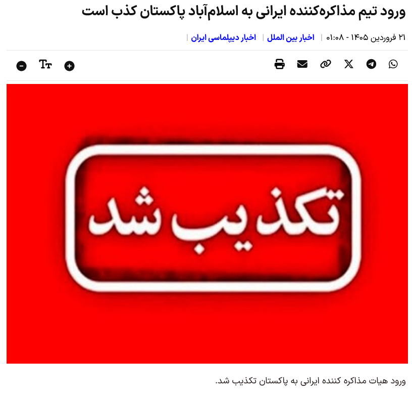 Eine informierte Quelle teilte der Nachrichtenagentur Tasnim mit: „Die Meldung einiger Medien, dass das iranische Verhandlungsteam in Islamabad, Pakistan, eingetroffen sei, um mit den Amerikanern zu verhandeln, ist völlig falsch.“