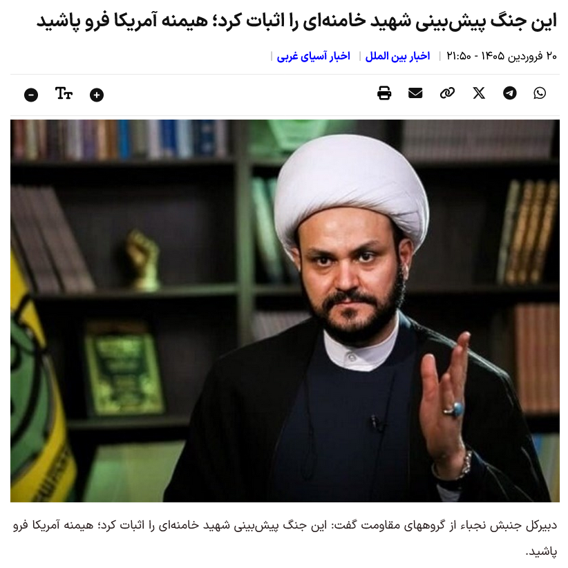Der Generalsekretär der Nujaba-Bewegung, einer Widerstandsgruppe, sagte: „Dieser Krieg bestätigte die Prophezeiung des Märtyrers Khamenei; die amerikanische Hegemonie brach zusammen.“
