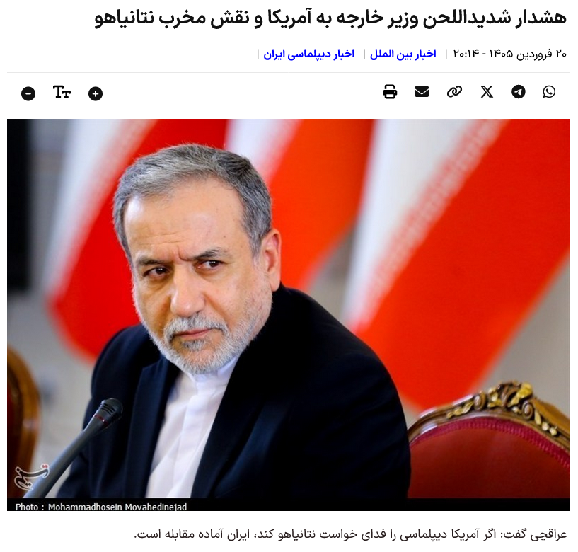 Laut der Nachrichtenagentur Tasnim International Group warnte der iranische Außenminister Seyyed Abbas Araqchi angesichts der jüngsten Entwicklungen vor der Fortsetzung des aggressiven Kurses Washingtons und der Rolle des israelischen Premierministers bei der Zerstörung des diplomatischen Weges.