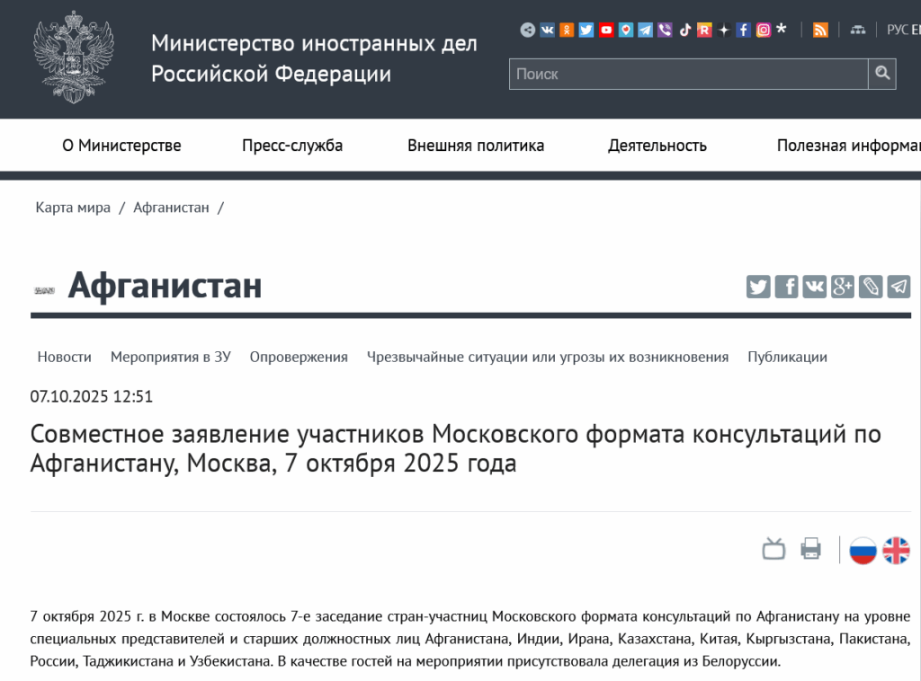 7 октября 2025 г. в Москве состоялось 7-е заседание стран-участниц Московского формата консультаций по Афганистану на уровне специальных представителей и старших должностных лиц Афганистана, Индии, Ирана, Казахстана, Китая, Кыргызстана, Пакистана, России, Таджикистана и Узбекистана. В качестве гостей на мероприятии присутствовала делегация из Белоруссии.