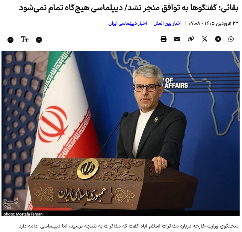 Laut der Nachrichtenagentur Tasnim International Group betonte der Sprecher des Außenministeriums in einem Kurzbericht zu den iranisch-amerikanischen Verhandlungen in Islamabad, Pakistan: Der Erfolg dieses diplomatischen Prozesses hängt davon ab, Übertreibungen und unzulässige Forderungen zu vermeiden und die legitimen Rechte und Interessen Irans anzuerkennen.