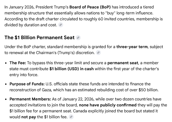 Nun ist unklar, ob die Trump-Administration diesen „Zahlungs-Vorgang“ aktzeptieren wird – und den (eigentlich unerwarteten) Eintritt Russlands (als permanentes Mitglied) in den Board of Peace (man hatte zwar Einladungen an Russland und China verschickt, ABER, nicht erwartet dass diese annehmen).