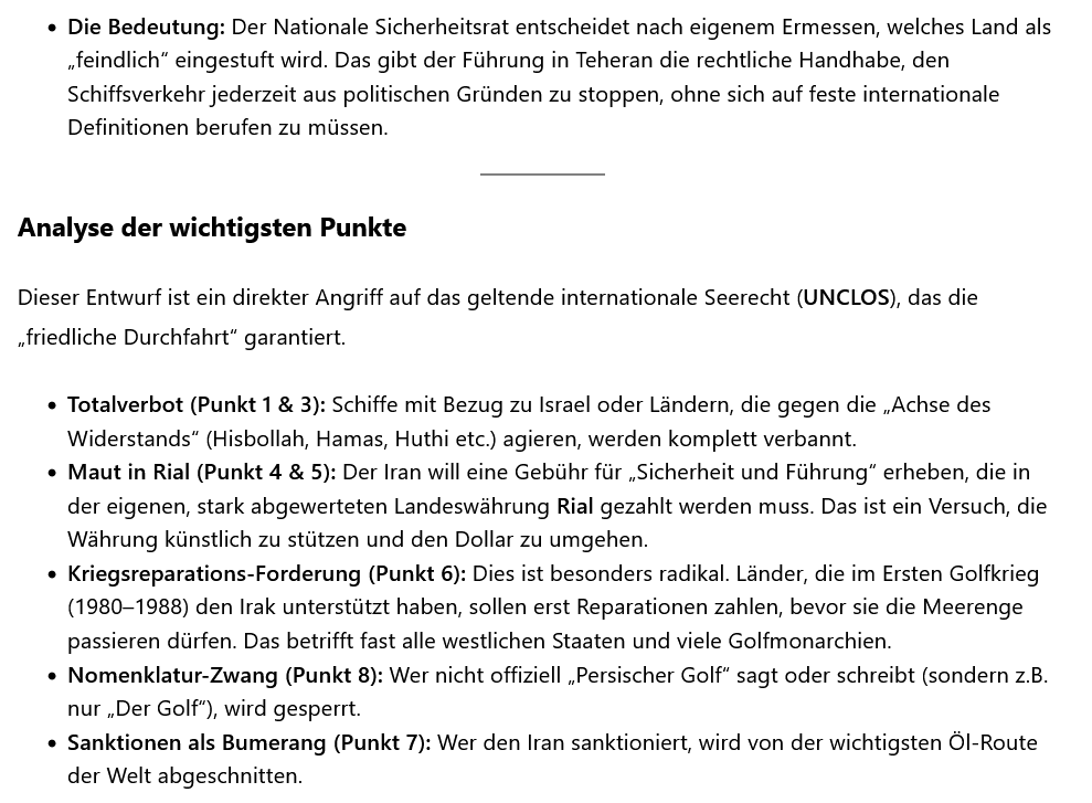 In der Praxis nutzt der Iran die geografische Lage als Hebel. Die von Ihnen zitierten 10 Punkte sind kein Ausdruck von geltendem internationalem Recht, sondern ein Entwurf für eine nationale Gesetzgebung, die darauf abzielt, das internationale Recht offen herauszufordern.