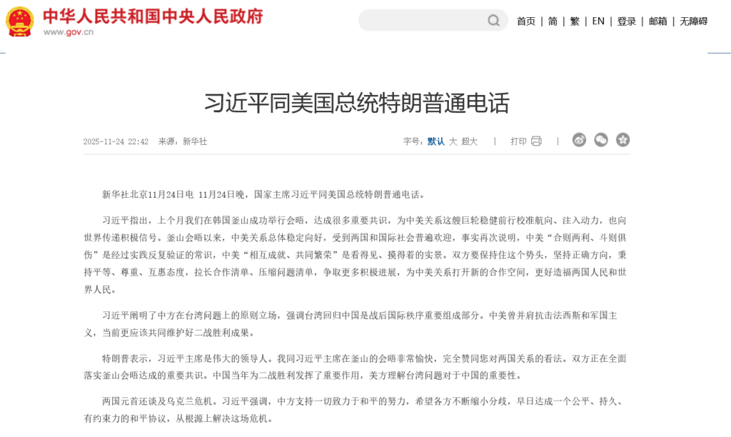 Xinhua-Nachrichtenagentur, Peking, 24. November – Am Abend des 24. November telefonierte Präsident Xi Jinping mit US-Präsident Donald Trump.