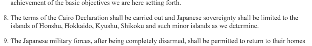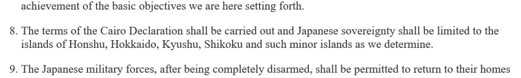 +> die Potsdam-(Japan)-Deklaration, das ausdrücklich die Kairo- Deklaration als weiteres Basis-Dokument anführt, unterschrieben von US, UK und China, sowie