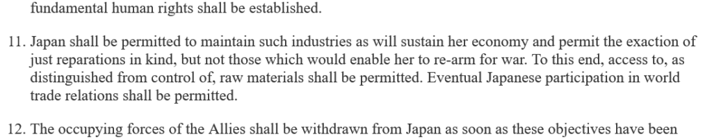 Des Weiteren die Frage, wie es denn möglich sei, dass Japan überhaupt selbst solche Waffen (wie diese Raketen) herstelle, wo doch Potsdam-(Japan)-Punkt 11 sehr klar sei: