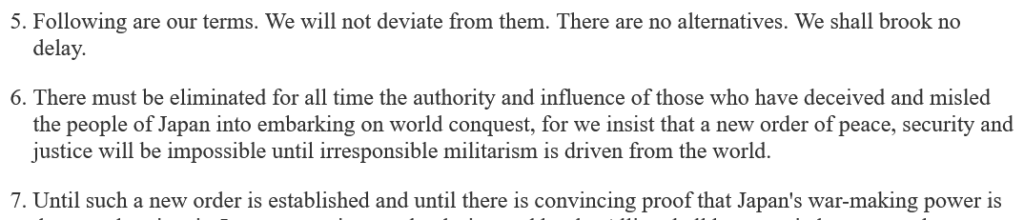 Des Weiteren die Frage, wie denn die USA zum klar dargestellten Militarismus stehen würden, wo doch Potsdam-(Japan)-Punkt 6 sehr klar sei: