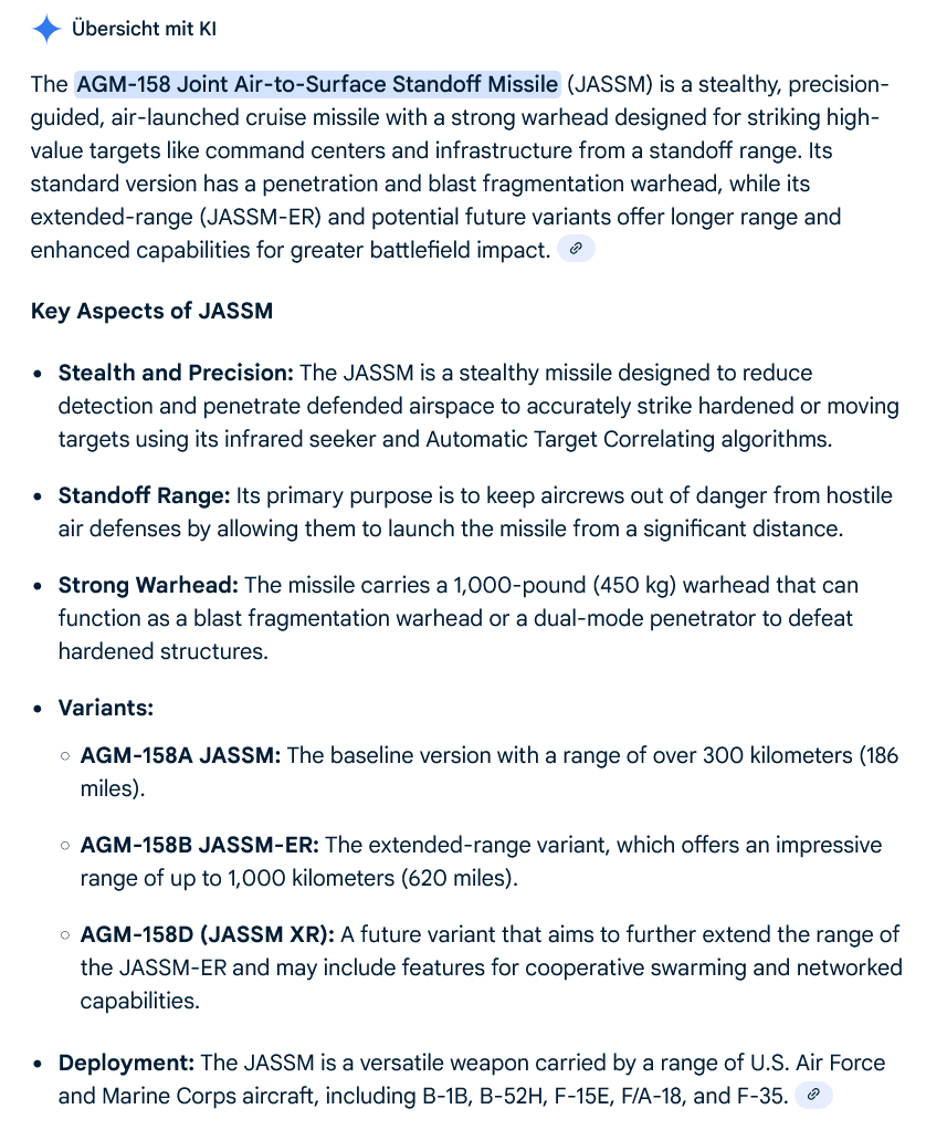 „Eine Art Entscheidung“ kann auch heißen: Es geht um Langstrecken- Angriffs- Systeme mit starkem Sprengkopf – ob das nun Tomahawk oder JASSM sind oder etwas anderes aus dem US- Arsenal= eigentlich egal.