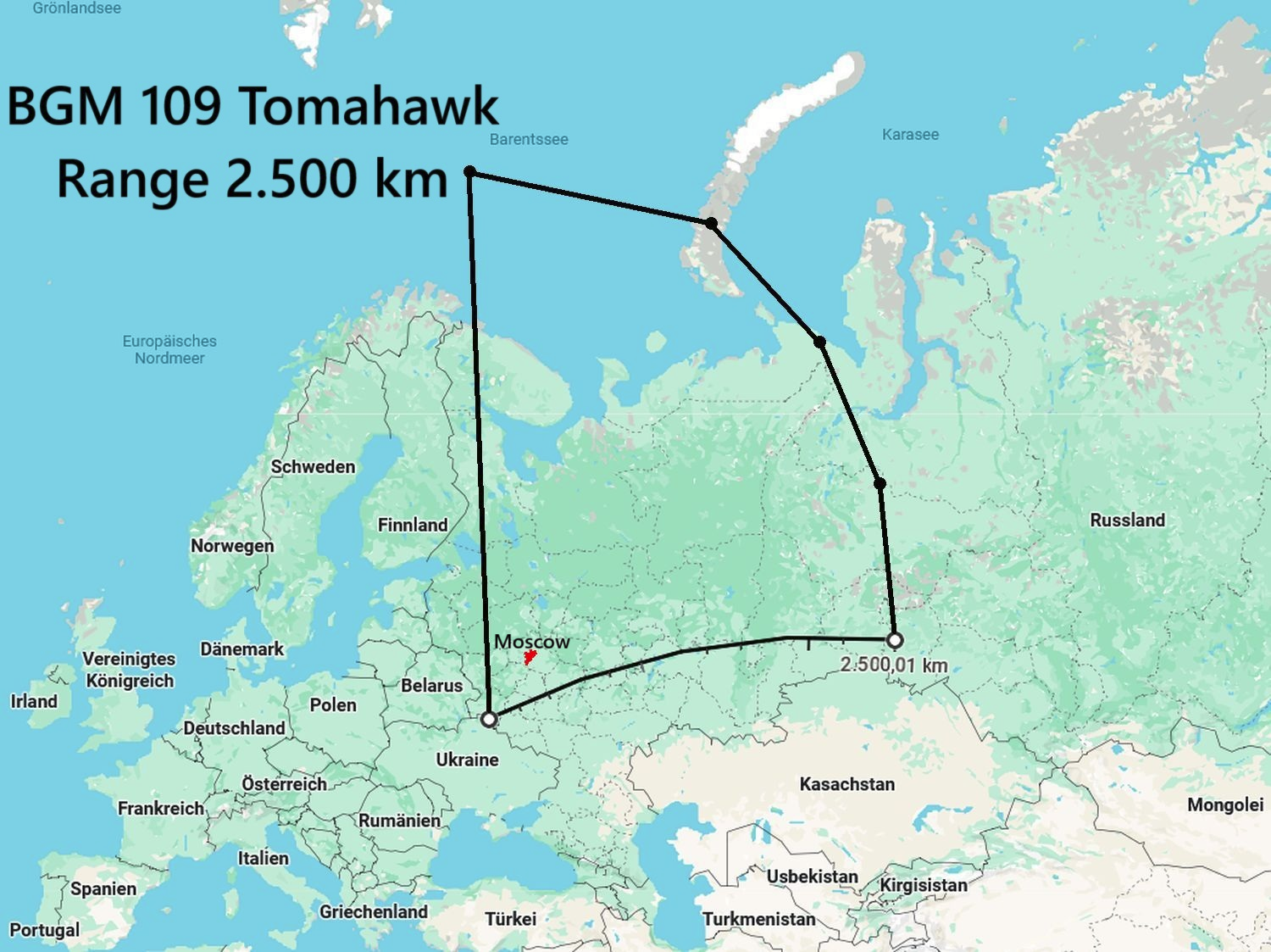 Titelbild: Reichweite des Tomahawk- Marschflugkörpers (=2.500 km) auf russischem Gebiet.