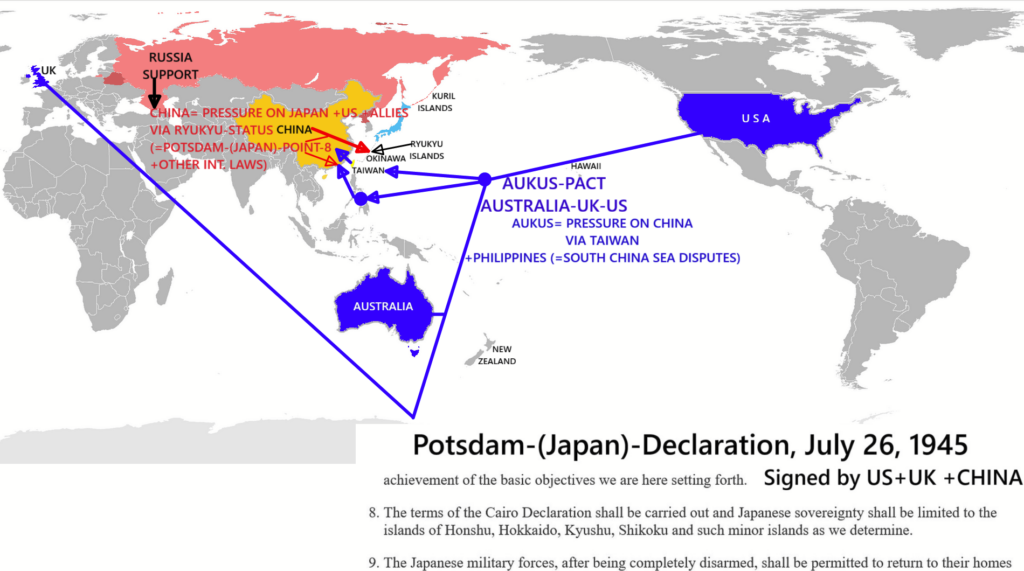 Im Falle der Asien-Front sind hier vor allem 3 Basis-Dokumente + weitergehende nach 1945 Ergänzungs- Dokumente zu beachten, aus denen sich dann die Resultate – wie sie in 2025 völkerrechtlich gegeben sind – rechtlich ableiten.