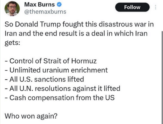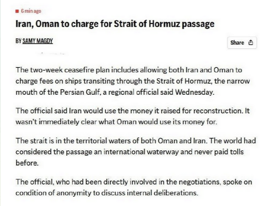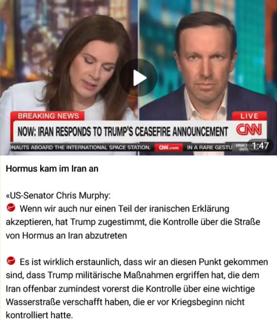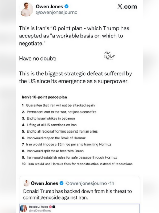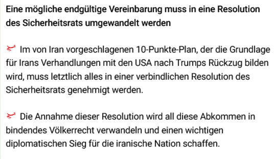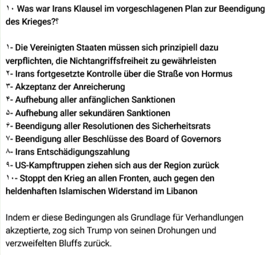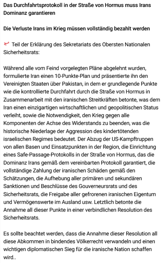Dieser 10-Punkte-Plan des Iran ist die Verhandlungsbasis – fixiert ist jedoch, dass der Iran die volle Kontrolle über die Straße von Hormuz behält. <<< Damit hat Iran die volle Kontrolle über den gesamten Warenfluss aus dem Golf= bestimmt die Wirtschafts-Möglichkeiten der Golf-Staaten umfassend. (Mehr kann man eigentlich nicht verlangen – nicht mehr die USA haben Arabien im Griff, sondern Iran).