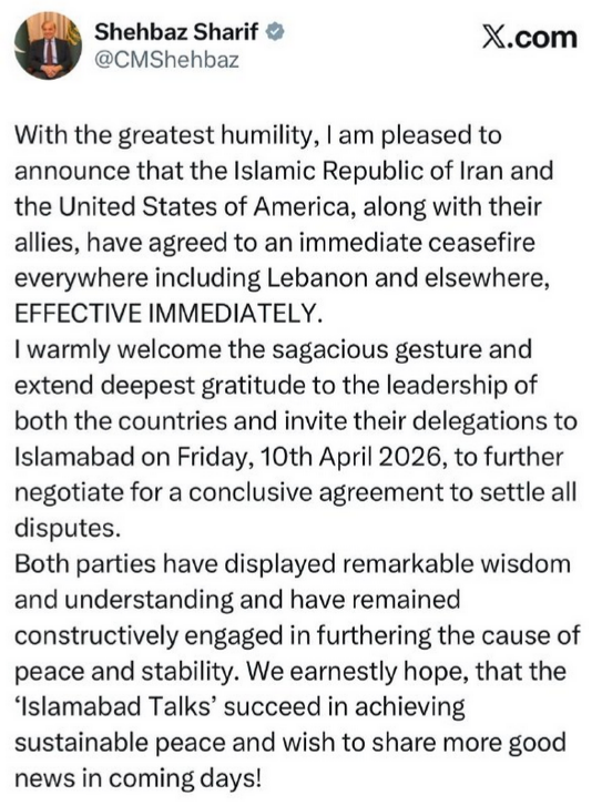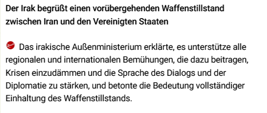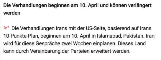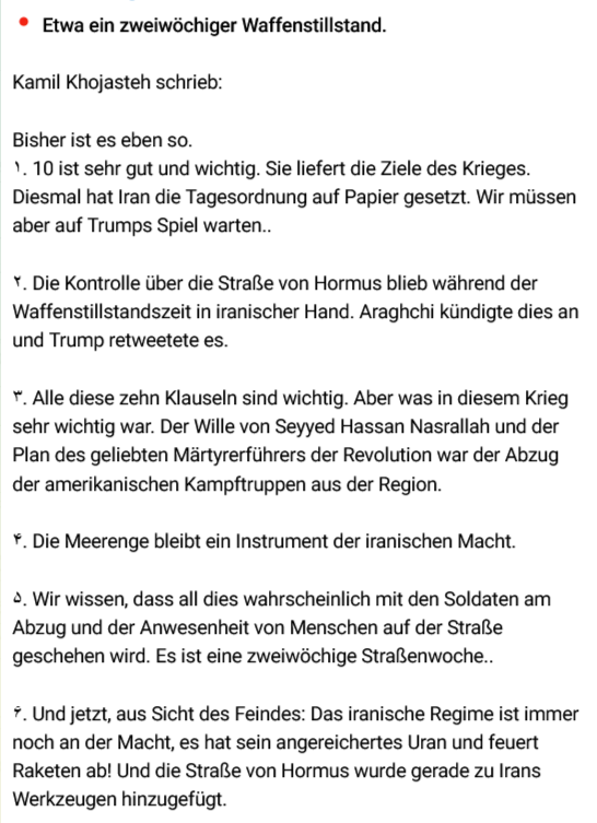 Der pakistanische Premierminister hat Iran nun mitgeteilt, dass die amerikanische Seite trotz aller offenkundigen Drohungen diese Prinzipien als Verhandlungsgrundlage akzeptiert und sich dem Willen des iranischen Volkes gefügt hat. Dementsprechend wurde auf höchster Ebene beschlossen, dass Iran zwei Wochen lang in Islamabad mit der amerikanischen Seite verhandeln wird, und zwar ausschließlich auf der Grundlage dieser Prinzipien. Es wird betont, dass dies kein Kriegsende bedeutet und Iran ein Kriegsende erst dann akzeptieren wird, wenn – im Hinblick auf Irans Akzeptanz der im Zehn-Punkte-Plan vorgesehenen Prinzipien – auch dessen Details in den Verhandlungen finalisiert sind.