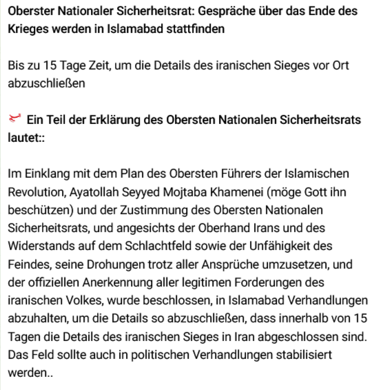 In diesem Zusammenhang und gemäß dem Rat des Obersten Führers der Islamischen Revolution, Ayatollah Seyyed Mujtaba Khamenei (möge Gott ihn beschützen), und der Zustimmung des Obersten Nationalen Sicherheitsrates, unter Berücksichtigung der Überlegenheit und des Widerstands Irans auf dem Schlachtfeld, der Unfähigkeit des Gegners, seine Drohungen trotz aller Behauptungen umzusetzen, und der offiziellen Anerkennung aller legitimen Forderungen des iranischen Volkes, wurde beschlossen, Verhandlungen in Islamabad aufzunehmen, um die Details zu finalisieren, sodass innerhalb von maximal 15 Tagen, nach der Finalisierung der Details des iranischen Sieges auf dem Schlachtfeld, dieser auch in politischen Verhandlungen gefestigt werden kann.