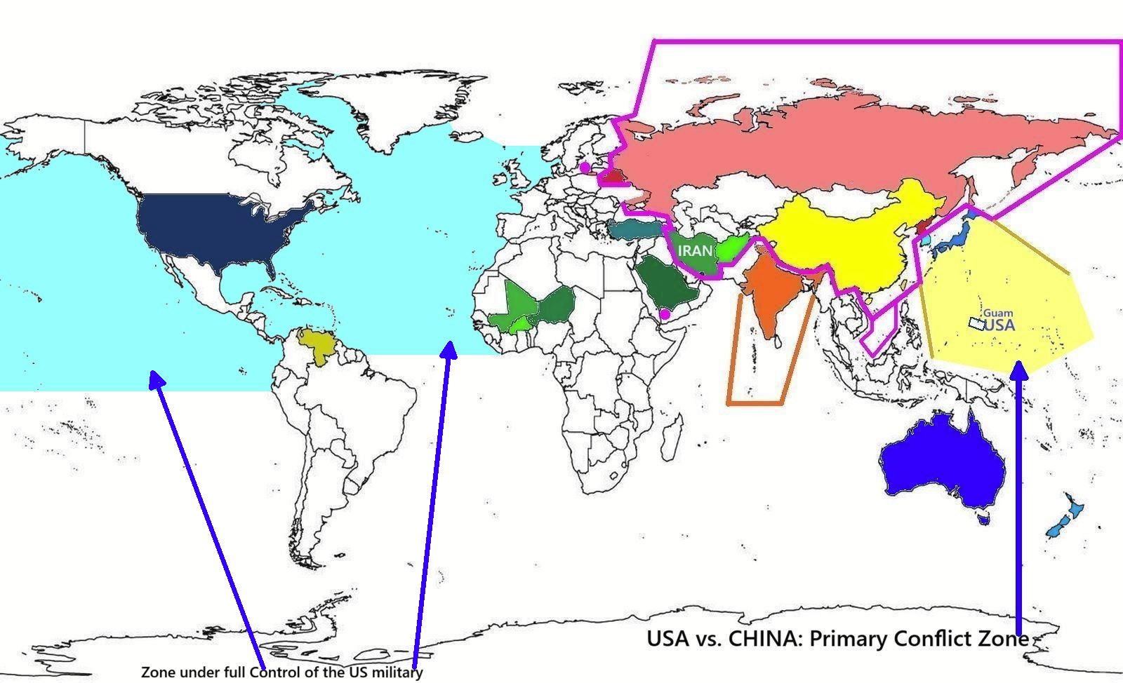 Die USA hätten eigentlich mit China eine gute Gelegenheit die Asien-Festung aufzuknacken – siehe gelbe Zone= Primäre Konflikt-Zone, ABER, die USA tun alles um diese Front ruhig zu halten – scheuen eine Auseinandersetzung.