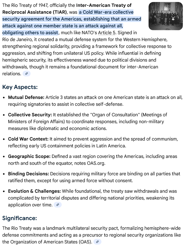 Man stelle sich vor, Venezuela würde – bezogen auf die aktuelle Lage – den Rio-Treaty ansprechen. Der Treaty – mit Hilfe-Ersuchen von Venezuela gegen die USA angewandt – wäre … (ein interessanter Ablauf).