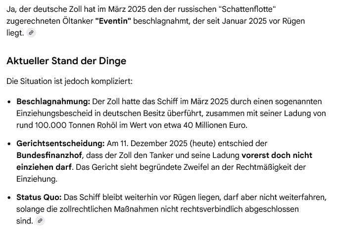 Man beachte hierzu, dass Deutschland schon ein „RUS-Schattenflotte-Schiff“ beschlagnahmt hat (liegt in einem D-Hafen als interniert vor Anker), und will dessen Öl auch behalten hat= USA kopieren Deutschland dahingehend.