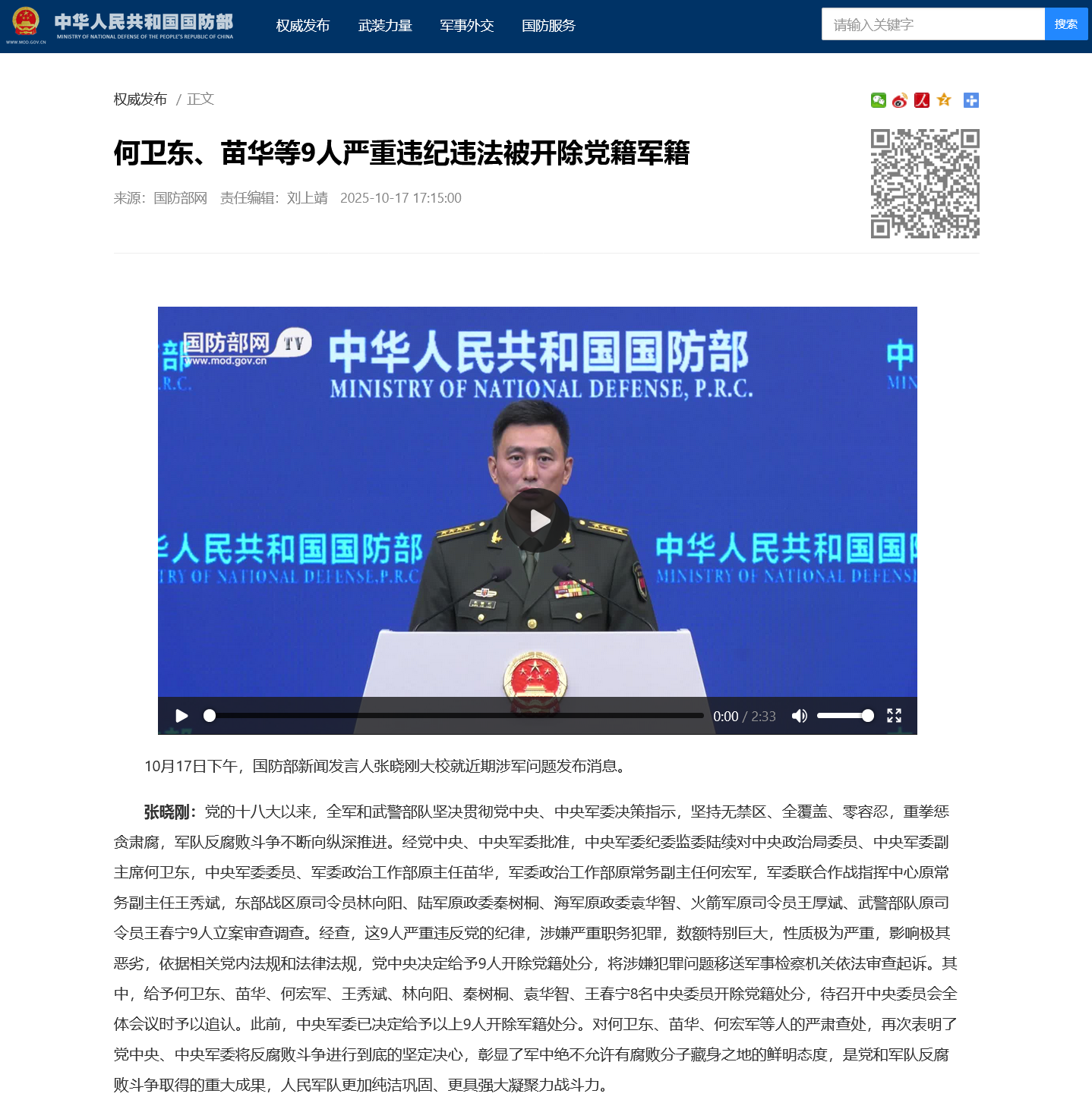 He Weidong, Miao Hua und neun weitere Personen wurden wegen schwerer Verstöße gegen Disziplin und Recht aus der Partei und dem Militär ausgeschlossen.