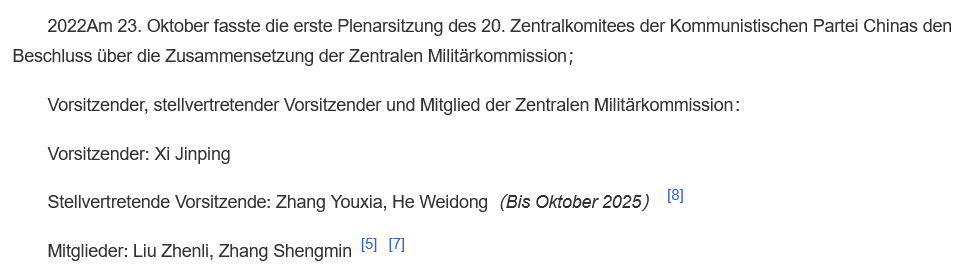 /> He Weidong, Mitglied des Politbüros des Zentralkomitees der KPCh und stellvertretender Vorsitzender der Zentralen Militärkommission der KPCh;