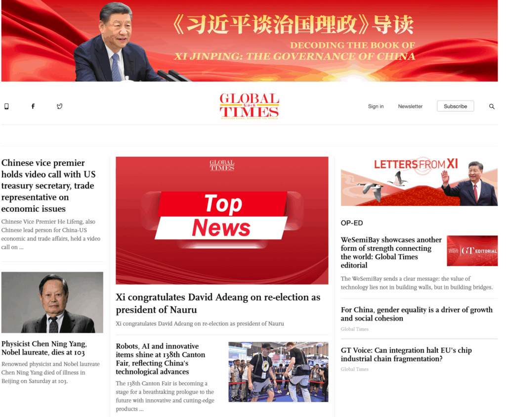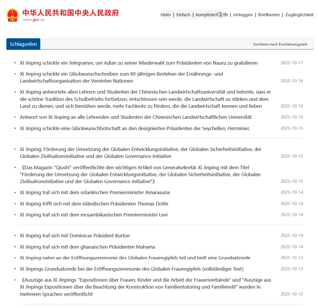 Die Website hat im Polit- Teil auch eine 5-Bilder-Slide-Show, davon AKTUELL 4 Bilder mit Xi Jinping, und ein Bild mit dem Pressespecher über die aktuell gegebene Presserkonferenz.
